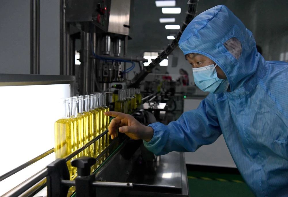 △3月27日,工作人员在河南省光山县一家油茶加工企业的灌装车间作业。