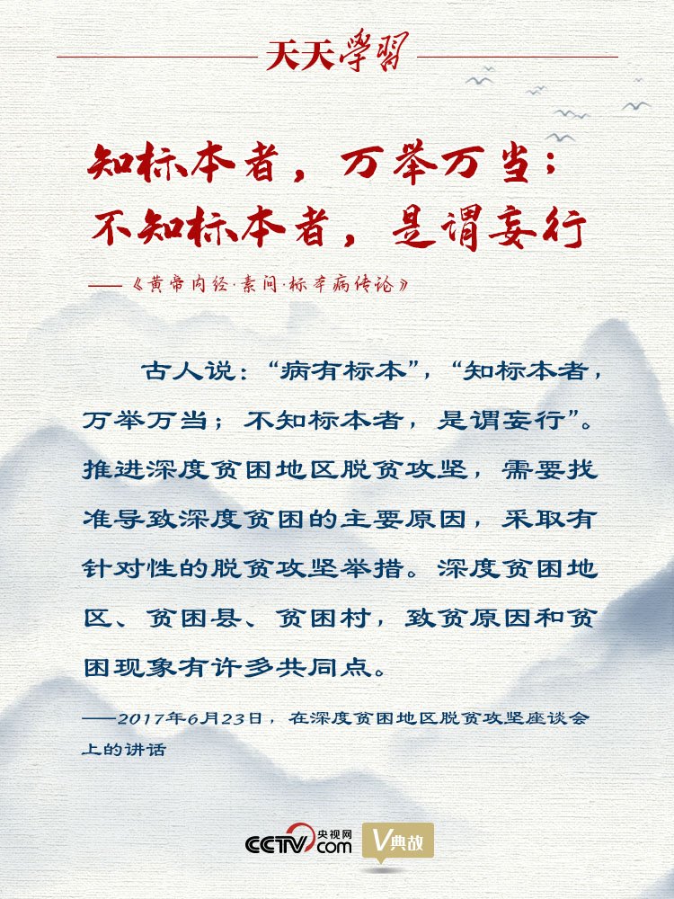 2017年6月23日,习近平总书记主持召开深度贫困地区脱贫攻坚座谈会并发表重要讲话。他在讲话中引用古语“病有标本”“知标本者,万举万当;不知标本者,是谓妄行”,指出深度贫困地区、贫困县、贫困村,致贫原因和贫困现象有许多共同点。推进深度贫困地区脱贫攻坚,需要找准导致深度贫困的主要原因,采取有针对性的脱贫攻坚举措。