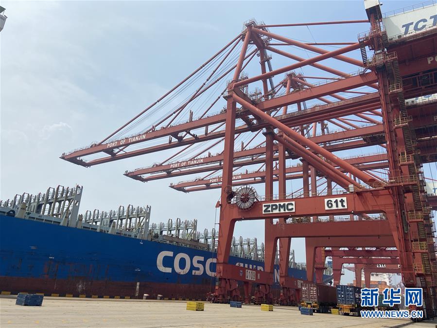 货车在天津港集装箱码头等待直提货物(8月4日摄)。 新华社记者 张宇琪 摄