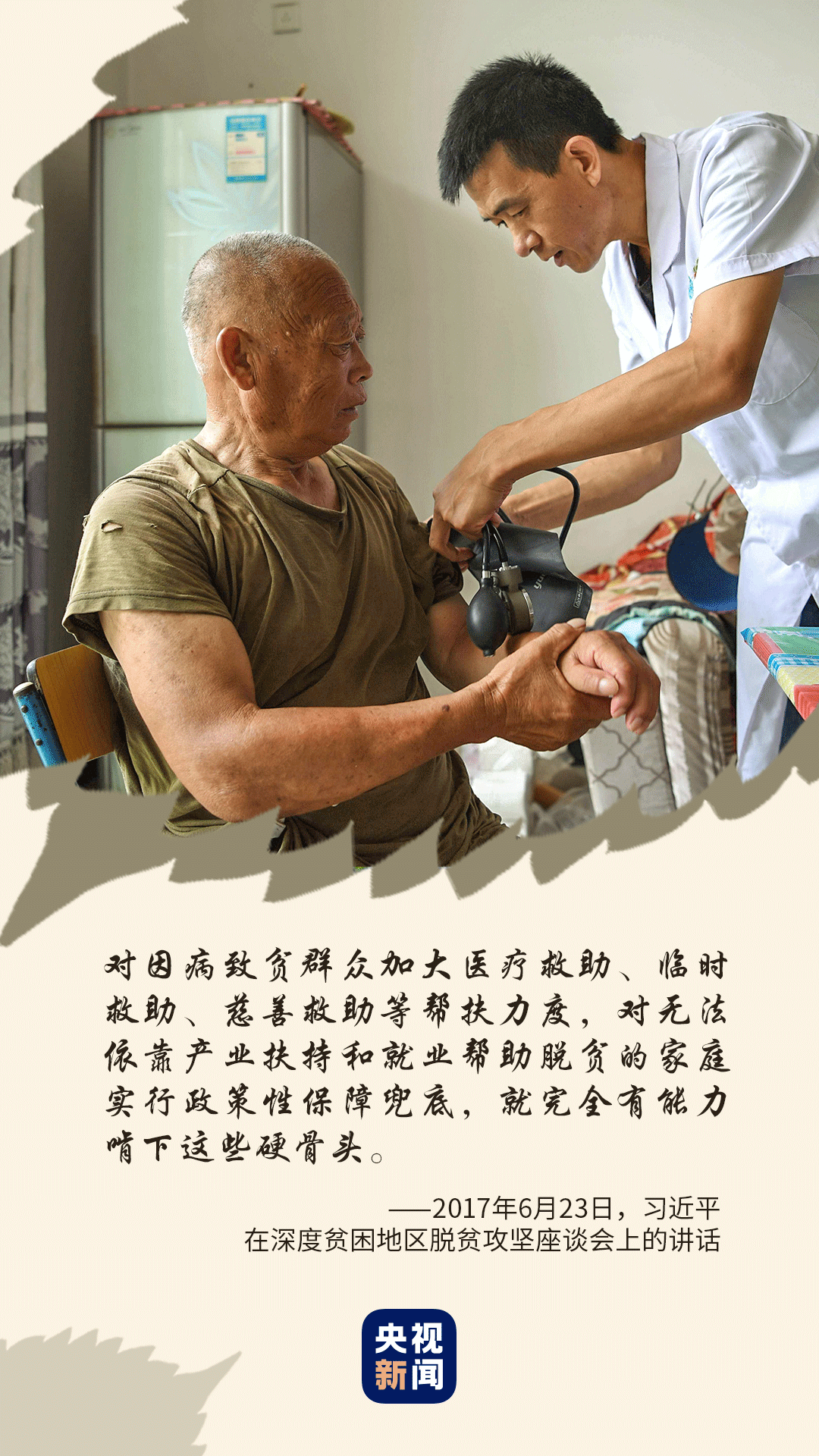 在吕梁山区深处的山西省岢岚县,习近平亲切看望患多种疾病的贫困户王三女,要求对因病致贫群众加大医疗救助、临时救助、慈善救助等帮扶力度。