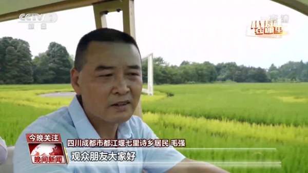 成都台记者 姜澜雨:迎着明媚的阳光,穿梭在现在近千亩的碧绿稻田里,不知道电视机前的观众朋友有没有和我一样感受到这个扑面而来的风吹麦浪的美妙的这样的情绪。那其实我现在所在的位置呢,是在成都都江堰的七里诗乡。那今天我来到这儿呢,不是单纯的来看风景的,我是带着任务来的,那就是沿着绿道找寻小康。不知道在这样的美丽乡村里,本地村民心目当中的小康生活又会是什么样的呢?刚刚呢我们在镜头当中是听到了有一位诗人在念诗,那其实呢,他不是其他人啊,他就是我们的本地村民,也是现在开着观光车载着我的毛强毛大哥。来毛大哥,我们先跟观众朋友打一个招呼吧。