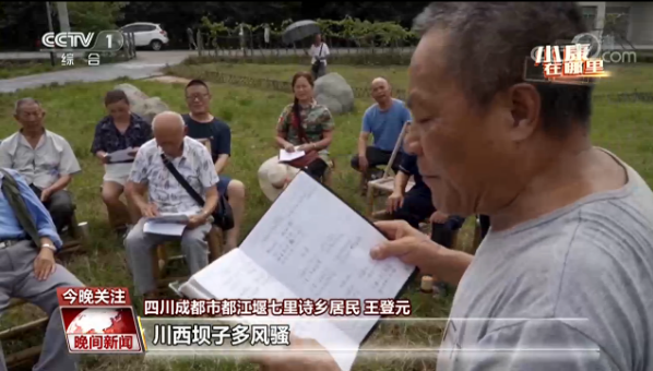 四川成都市都江堰七里诗乡居民 毛强:这个就是我们石羊镇七里诗乡的,我们本乡本土的那个农民诗人自己创作的。