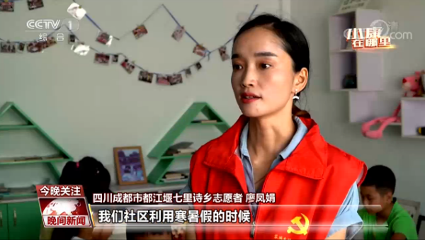 四川成都市都江堰七里诗乡志愿者 廖凤娟:我们社区利用寒暑假的时候,召集孩子们到咱们儿童之家学习诗歌朗诵,从小培养他们对诗歌的兴趣,这也是对咱们七里诗乡对文化的一个传承。