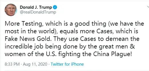 对于正全力争取连任的美国总统特朗普来说,本国疫情的失控已经成了他最大的一块心病。为此,他日前再发推文,为自己的抗疫不力辩护:“更多的病毒检测虽然是件好事,但也等于出现了更多病例,而这会给媒体制造‘假新闻’提供炮弹,诋毁美国人为应对‘中国瘟疫’所做出的伟大努力。”