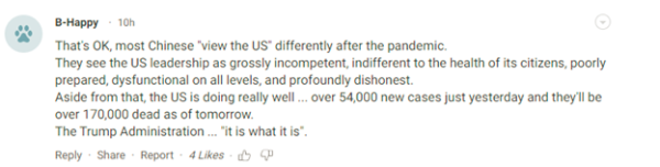 不过,从美国网民的反对声来看,越来越多的明眼人已经对这类抹黑说辞有了免疫力。有网友就接着特朗普的话反唇相讥:“在疫情大流行之后,大多数中国人对美国的看法也不同了。”