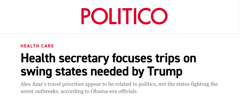 奥巴马时期的官员就曾指出,阿扎出行地点的选择似乎优先考虑的是政治因素,而不是疫情严重程度。据美国政治新闻网站Politico报道,自4月下旬以来,阿扎的11次出行当中,有9次的目的地都是总统特朗普急需争取选票的“摇摆州”。