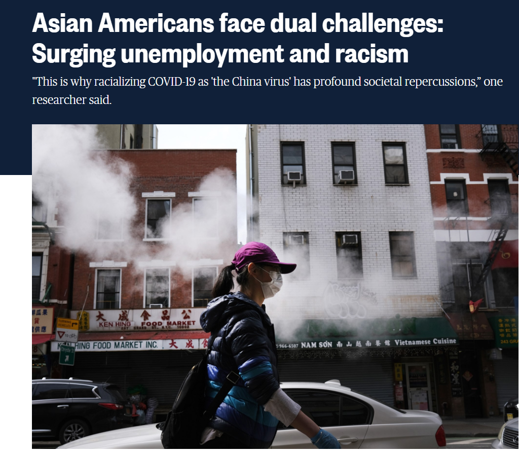 美国全国广播公司(NBC)报道:亚裔美国人面临双重挑战:失业和种族主义歧视急剧增加。一位研究人员说:“这就是为什么将新冠肺炎污名化化为'中国病毒'会产生深远的社会影响。”