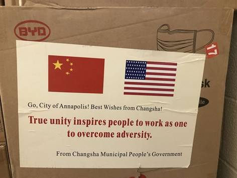 据《首都公报》报道,一些口罩于8月份抵达安纳波利斯市,其中一个包装箱上印有中国和美国国旗,上面写着:“加油,安纳波利斯!来自长沙的祝福!真正的团结鼓舞人们齐心协力克服困难。”