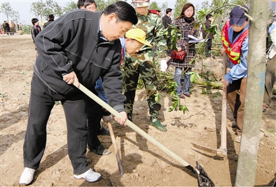 2007年2月28日,习近平在杭州钱江新城副阳台景观绿化工程现场参加义务植树活动。
