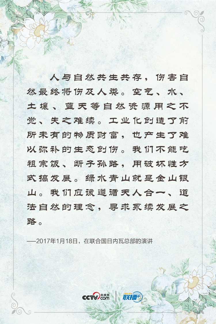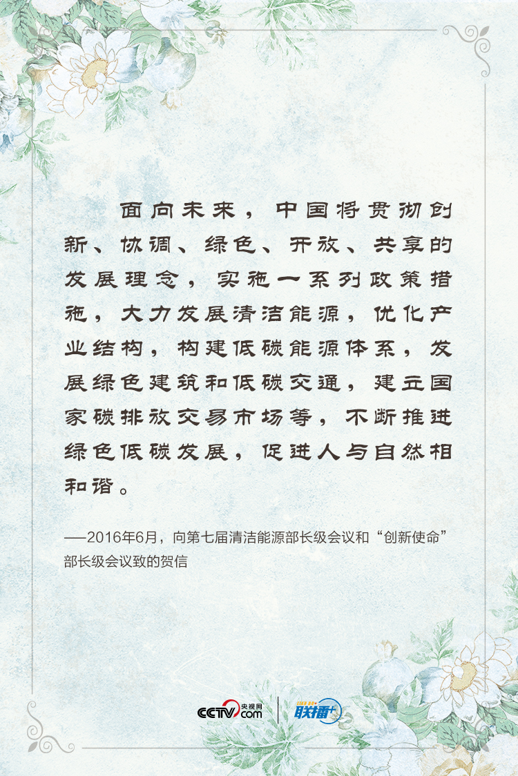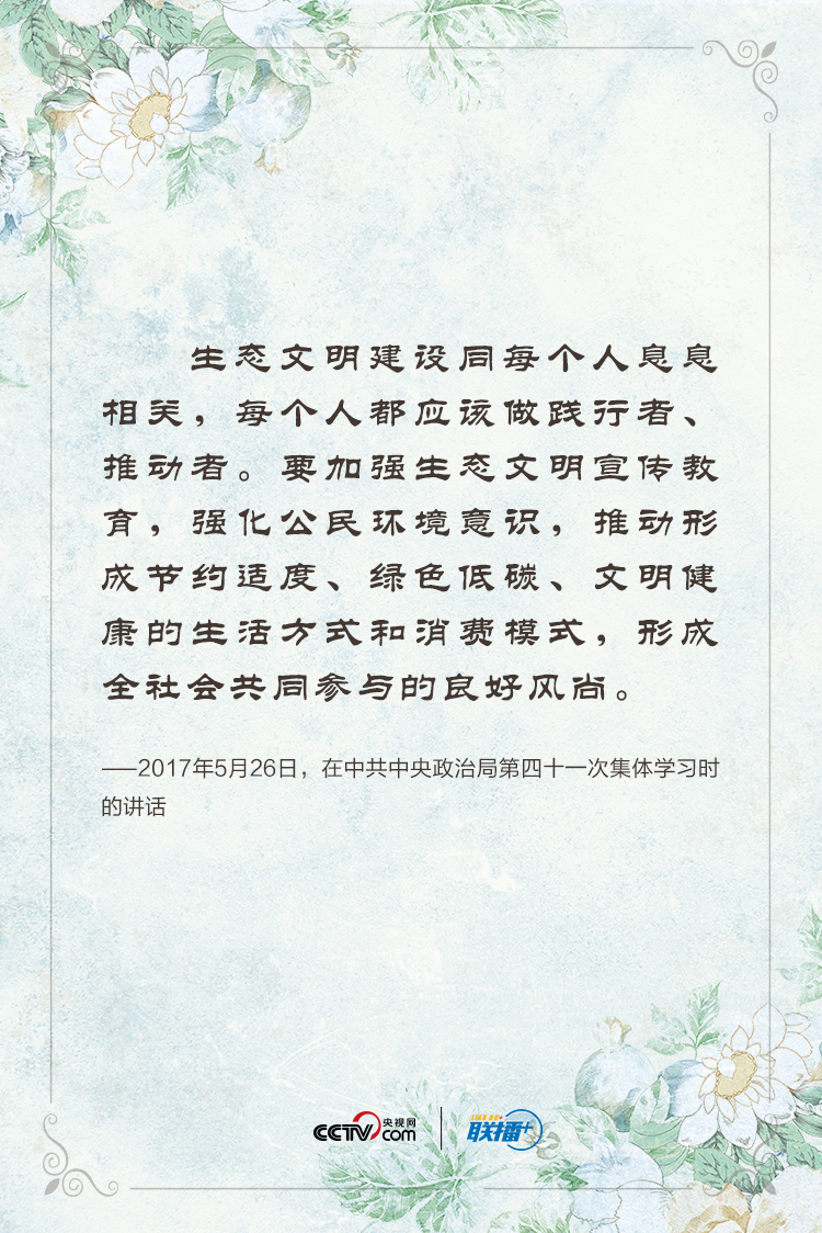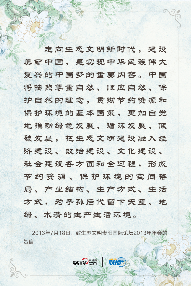 联播+“绿水青山就是金山银山”,“我们要倡导绿色、低碳、循环、可持续的生产生活方式”,“建设天蓝、地绿、水清的美丽中国,让人民切实感受到发展带来的生态效益”。
