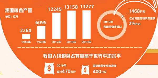 程国强:解决好吃饭问题,是中国人千百年来梦寐以求的目标。新中国成立后特别是改革开放以来,在中国共产党的领导下,我国经过艰苦奋斗和不懈努力,在农业基础十分薄弱、资源条件极其有限的基础上,依靠自身力量,实现了由“吃不饱”向“吃得饱”,进而追求“吃得好”的历史性转变。这既是世界粮食安全的巨大成就,也是全球农业的历史奇迹。统计数据显示,1949年,我国粮食产量只有1.1318亿吨左右,人均粮食占有量只有209公斤;2019年,我国粮食产量已经连续多年突破6.5亿吨,人均粮食占有量上升至470公斤,比新中国成立时的209公斤增长了126%,高于世界平均水平。目前,我国谷物自给率超过95%,水稻和小麦两大口粮自给率超过100%,中国人已经将“饭碗”牢牢端在了自己手上。