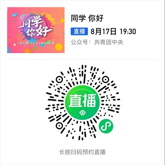 全国学联与你同拼搏,同前进,共享这场青春盛会。长按下方图片扫码预约直播吧,不见不散!
