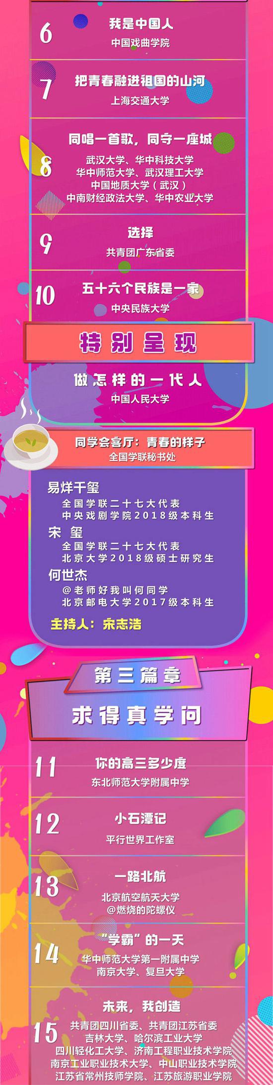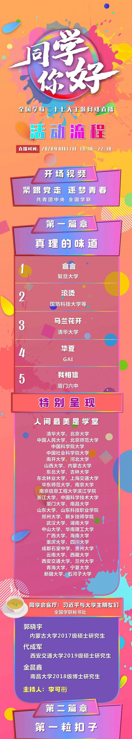 会议期间,团中央全国学联将于2020年8月17日19:30,通过“学习强国”学习平台、央视新闻客户端及@共青团中央微信、微博、B站、快手、抖音、微视、斗鱼、虎牙、今日头条等官方账号及等平台开展主题网络直播活动,更多精彩,欢迎锁定!
