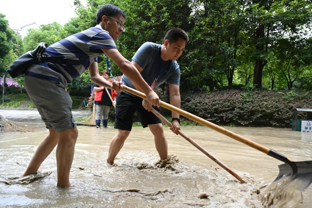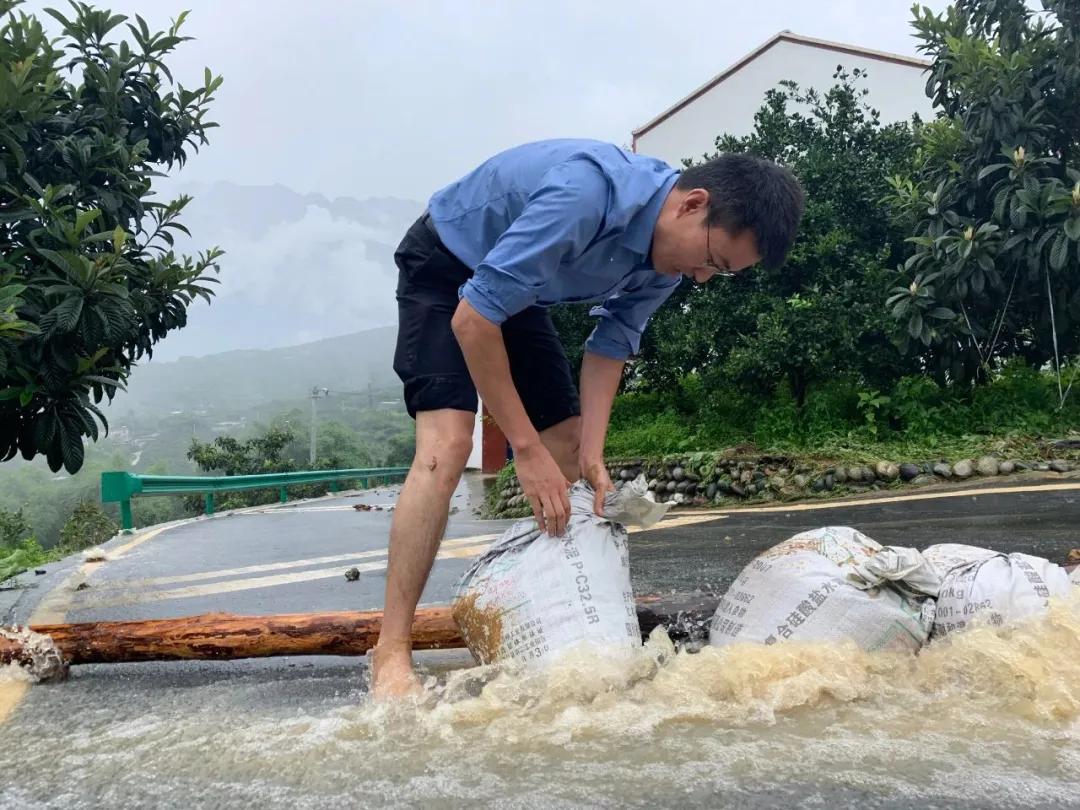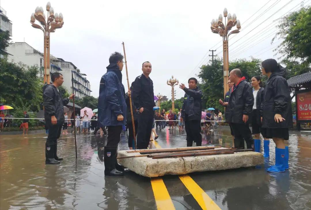 8月17日晚,乐山市区暴雨如注,市中区检察院检察长周发祥带领干警投入全福街道抗洪抢险第一线。