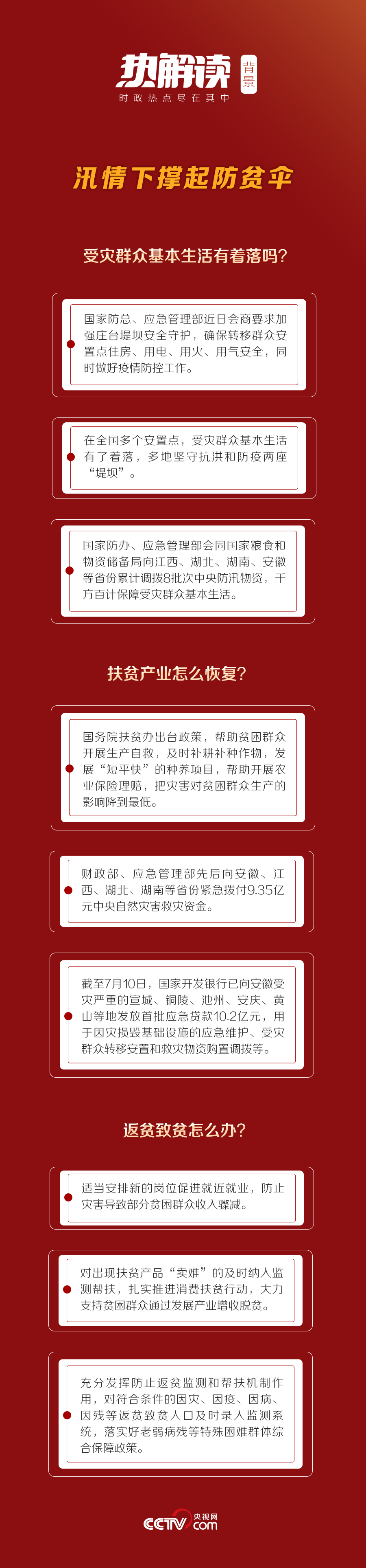 眼下,安徽省正抓紧落实35项政策措施以防止因洪涝灾害致贫返贫。多地村干部统计受灾家庭情况,倒塌房屋重建,政府户均补助2万元;每吸纳一位沿淮行蓄洪区贫困户就业,阜阳市当地政府给予一次性补贴2000元,上不封顶;六安市157家扶贫车间已经全面恢复生产……