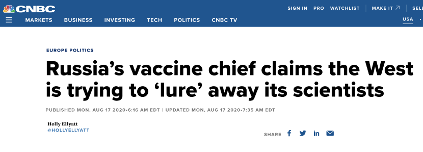 近日,俄罗斯宣布注册并生产全球首款新冠疫苗的消息,在西方舆论场一石激起千层浪。西方主流媒体几乎步调一致地对俄罗斯表示质疑,称“俄罗斯疫苗未经证实,安全存在隐患”,美国食品和药物管理局(FDA)前助理局长彼得·皮茨(Peter Pitts)嘲讽道“与其说是疫苗,不如说是莫洛托夫鸡尾酒”。然而,讽刺的是,美国消费者新闻和商业频道(CNBC)17日报道指出,美国和欧洲的研究机构正试图从俄罗斯“挖走”疫苗研究的科学家。
