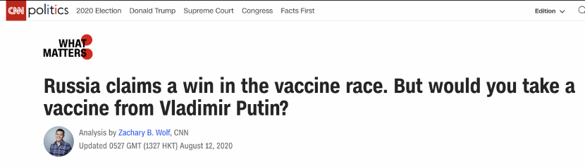 美国有线电视新闻网(CNN)12日在报道中抛出一连串疑问:“俄罗斯宣称赢得疫苗竞赛,但是普京的疫苗你会用吗?”《纽约时报》发文声称,俄罗斯正陷入全球疫苗争夺赛中,普京总统将这场竞赛视为个人领导力和国家制度的优劣对比。