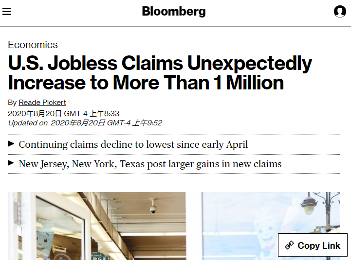 美国劳工部8月20日发布数据显示,截至8月15日的一周内,美国首次申请失业救济人数环比增加13.5万,达110.6万人,高于彭博社经济学家调查预估中值的92万人。这是该指标自此前一周降至97.1万之后,再度突破100万大关。