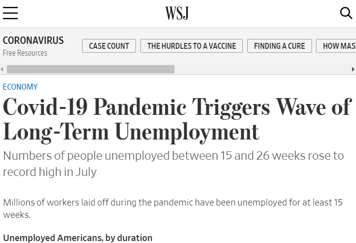 △《华尔街日报》称,新冠肺炎疫情引发长期失业浪潮,7月美国失业15至26周的人数创纪录