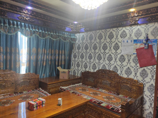 掀开门帘进屋,左手边是客厅。吊灯和四周围绕一圈的小筒灯,照得屋里亮堂堂。各种家具都是新添置的,一应俱全。提到过去居住的房子,白玛拉珍说:“之前的房子不好,只有三间房,全家人都挤在一个房间里睡,厨房也是这间屋子。”
