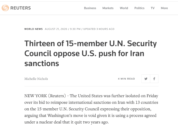 当地时间8月20日,美国国务卿蓬佩奥向本月联合国安理会轮值主席致函,正式要求启动安理会第2231号决议规定的“快速恢复制裁”机制,并宣称30天内安理会将恢复以往全部对伊制裁措施。路透社报道称,这一举动让美国进一步陷入孤立,15个联合国安理会成员国中13个均表示反对。