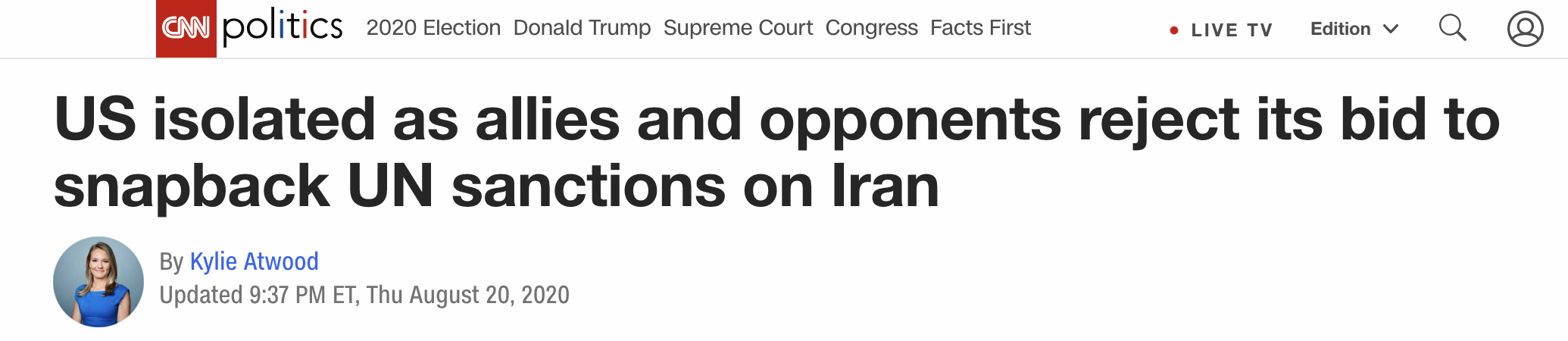 美国有线电视新闻网(CNN)指出,美国盟友和竞争对手都拒绝了美启动对伊朗制裁这一要求,特朗普政府在世界舞台上被孤立。