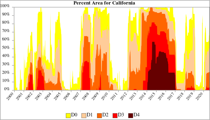 △图:加州干旱地区比例,据系统数据显示,干旱可分为D0-D4五个级别,逐级递增。最高级别D4可导致大面积的农作物和牧草死亡及用水紧张等情况(图片来源:美国国家集成干旱信息系统)
