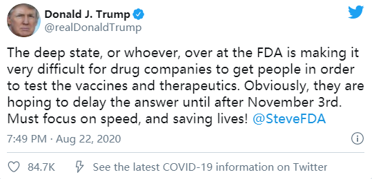 当地时间8月22日,特朗普在社交媒体上“炮轰”美国食品药品监督管理局(FDA),指责该机构“有人故意拖延疫苗试验”,推迟新冠疫苗和药物疗法的开发,导致可能要到11月大选过后才会有疫苗。他在这篇推文中还特意“点名”该机构局长斯蒂芬·哈恩。
