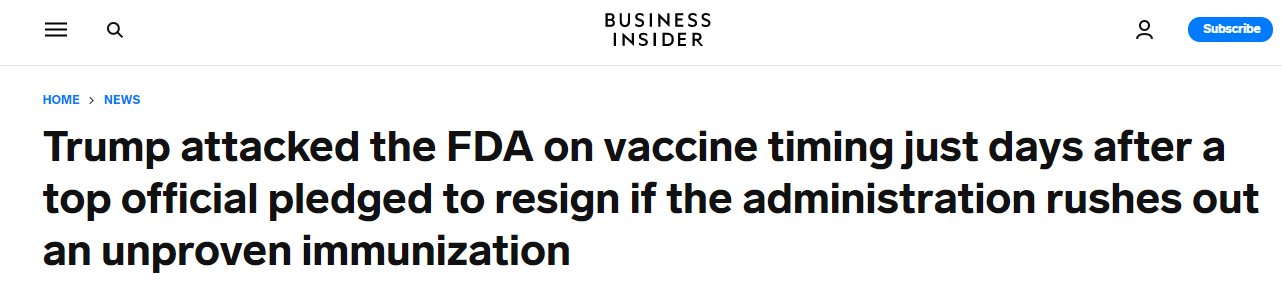 批评人士普遍担心,特朗普政府将在大选前以牺牲安全为代价,将新冠疫苗当作政治“筹码”,向食药监管局施压,盲目推进疫苗研发。