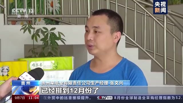 贵州某纸业有限责任公司生产经理 张文兴:从3月份到6月份接的单,已经排到12月份。一个月我们的出口量的话跟以前(去年同期相比)上升了有30%左右。