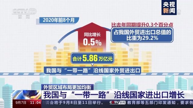 据海关统计,今年前8个月,我国与“一带一路”沿线国家外贸进出口合计5.86万亿元,同比增长0.5%,占我国外贸进出口总值的比重为29.2%,比去年同期提升0.3个百分点,其中我国与泰国、埃及、波兰进出口分别增长10.1%、8%和12.3%。