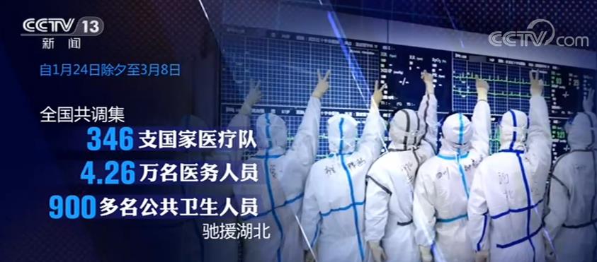 自1月24日除夕至3月8日,全国共调集346支国家医疗队、4.26万名医务人员、900多名公共卫生人员驰援湖北。19个省份以对口支援、以省包市的方式支援湖北省除武汉市以外16个地市。