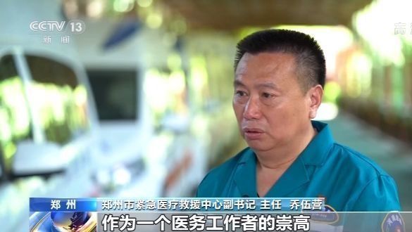 郑州市紧急医疗救援中心副书记 主任 乔伍营:有一天我们转运一个80多岁的老奶奶,(说)谢谢你们医务工作者,你们挽救了我们第二次生命,况且你们跑这么远来救我们,我真的谢谢你们,给我们鞠了一躬,这一躬,让我们队员泪水都出来了,让我们深深感觉到,作为一个医务工作者的崇高。
