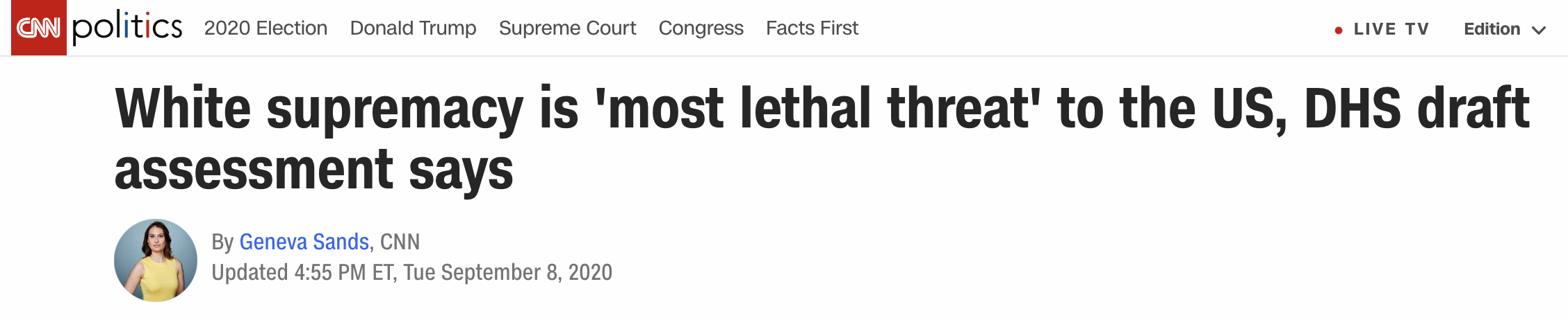 据美国有线电视新闻网(CNN)披露,美国国土安全部尚未发布的文件草稿称,到2021年,白人至上主义者仍将是美国最“持久和致命的威胁”。