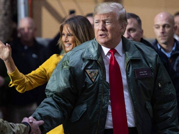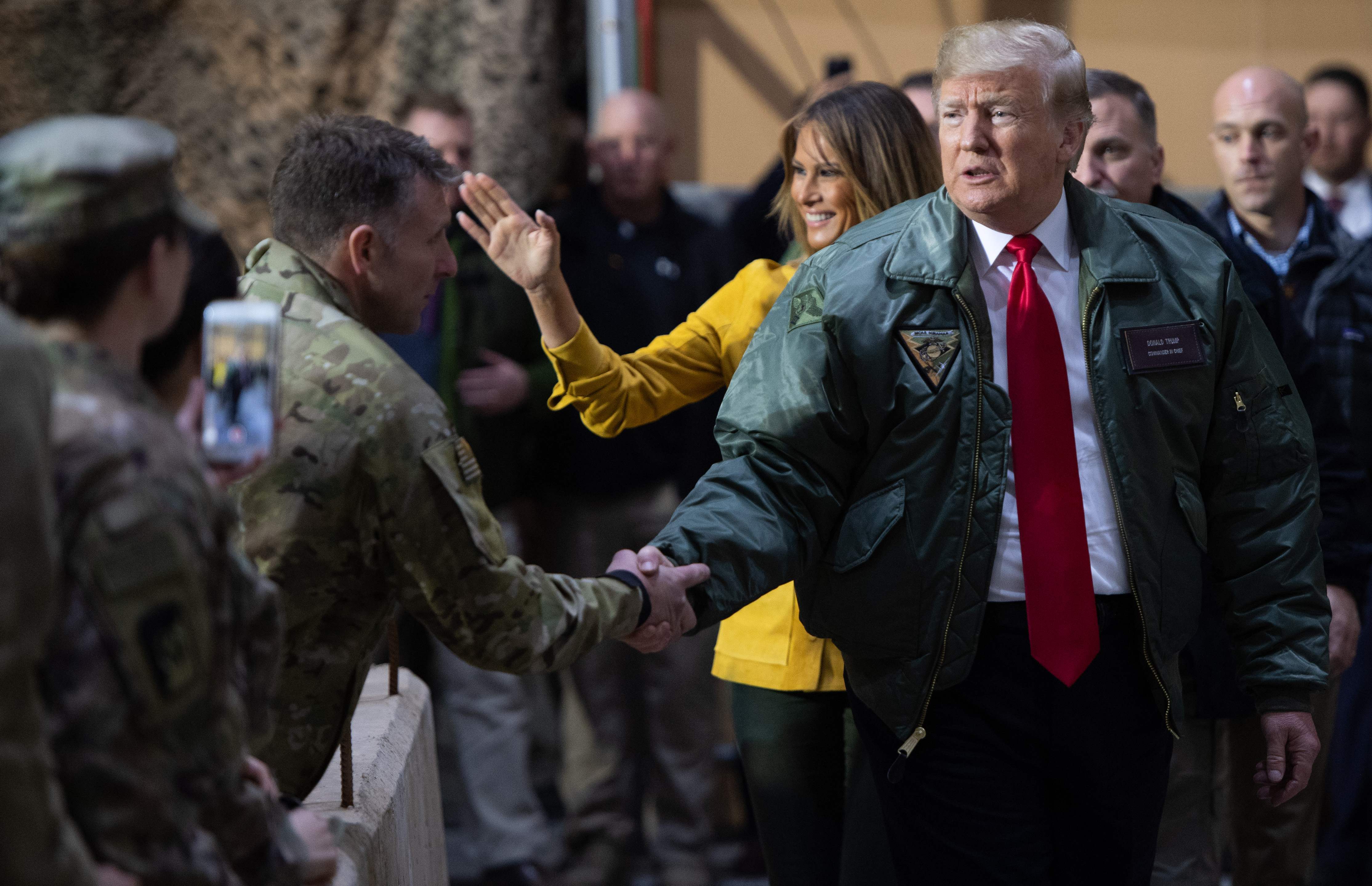 2018年12月26日,在伊拉克西部安巴尔省的阿萨德空军基地,美国总统特朗普(右)与驻伊美军官兵握手。(新华社/法新)