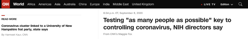 据美国有线电视新闻网(CNN)8日报道,来自美国国立卫生研究院下属研究机构美国国家儿童健康与人类发展研究所、美国国立医学图书馆、美国国立心肺血液研究所、美国国立精神卫生研究所等单位的11名主任,联合撰写了一篇博文,文章明确指出,“尽可能多地进行检测”对于抗击疫情大流行至关重要。