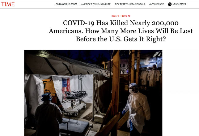 美国《时代》周刊在其官网刊文质问:“新冠疫情已经夺去近20万美国人的生命,在美国走到正确的抗疫路上前,还将付出多少生命的代价?”