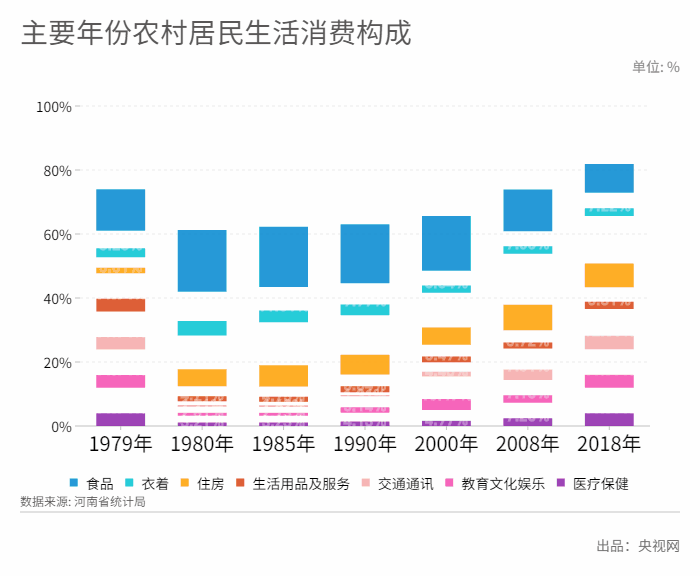 党的十一届三中全会以后,河南农村居民收入水平迅速提高,生活消费状况很快得到根本改善。2018年,全省农村居民人均生活消费支出提高到10392元,是1949年的272.8倍,年均增长8.5%;是1978年的127.2倍,年均增长12.9%。