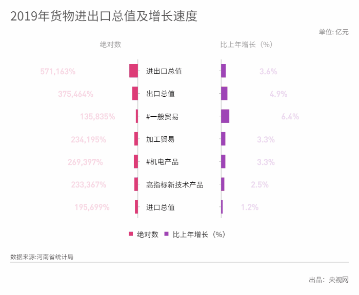 2019年,河南省货物进出口总值5711.63亿元,比上年增长3.6%。其中,出口总值3754.64亿元,增长4.9%;进口总值1956.99亿元,增长1.2%。