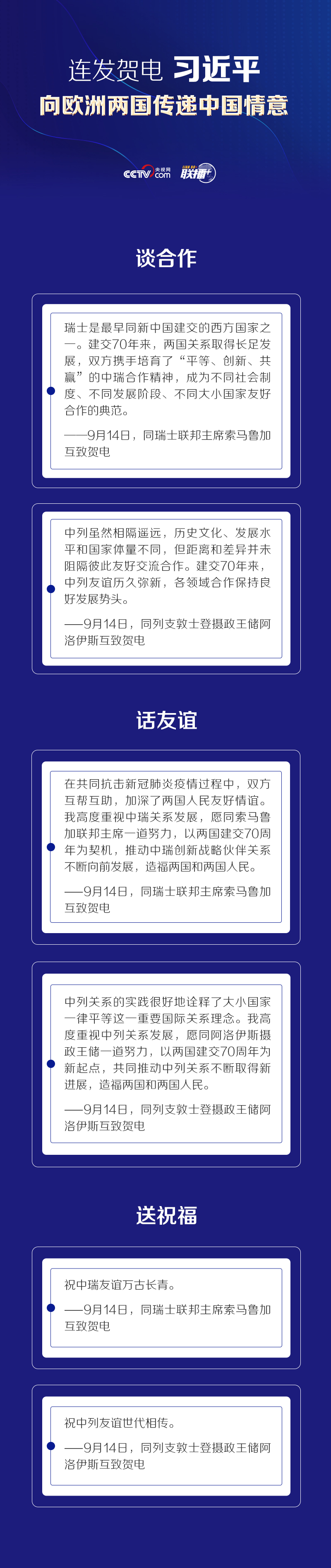 联播+9月14日,习近平主席就中瑞、中列建交70周年,分别同瑞士联邦主席索马鲁加、列支敦士登摄政王储阿洛伊斯互致贺电。