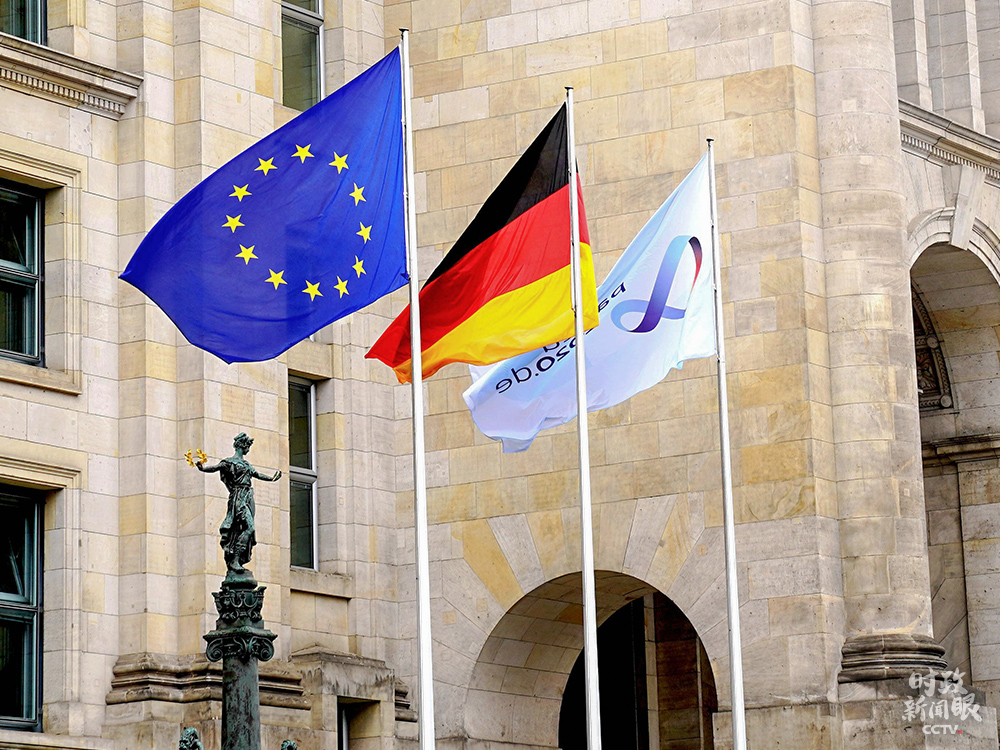 △今年7月1日起,德国接任欧盟轮值主席国,为期半年。这是德国国会大厦前从左到右依次挂出代表欧盟、德国和德国担任欧盟轮值主席国的三面旗帜。