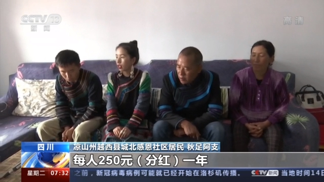 四川凉山州越西县城北感恩社区居民 秋足阿支:前三年我们是每户每人250元(分红)一年,然后后面每年就是每户每人1500元一年(分红)。