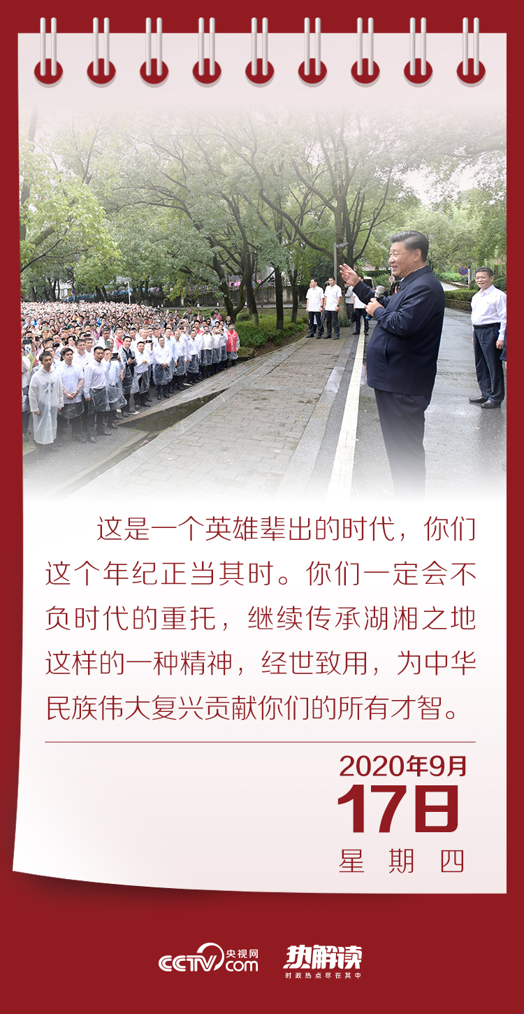 离开校园时,习近平总书记深情地对师生们说:“岳麓书院一直是我有牵挂,这个学院在我们的传统文化中的地位、影响,我还是很有感触的。”总书记特别剖析了“惟楚有材,于斯为盛”这副古联背后的深意:“于斯为盛,我的体会一个就是我们湖南人才济济,代有才人出啊,有报效祖国的栋梁之材。再有呢,于斯为盛这个‘斯’,是指的这个时代。明年是第十四个‘五年规划’开局之年,是我们开启‘第二个百年’新征程的起点。这是一个英雄辈出的时代,你们这个年纪正当其时。”