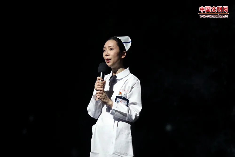 华东医院外科重症监护室护士长、上海第一批援鄂医疗队队员陈贞现场讲述“抗疫”故事。中国文明网 赵洋 摄