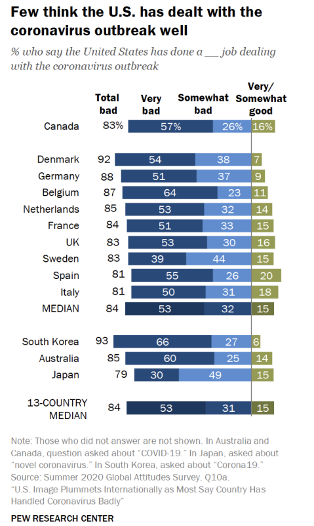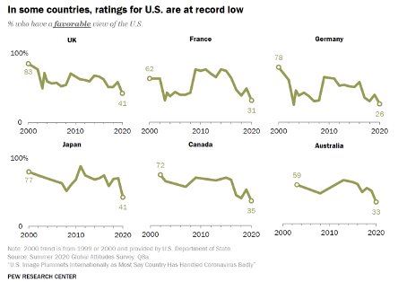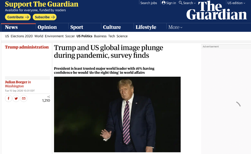 英国《卫报》近日报道指出,美国独立民调机构皮尤研究中心日前发布的全球调查结果显示,由于美国政府疫情应对的不力表现,美国国家形象和美国总统特朗普的个人形象从差劲跌至糟糕透顶。