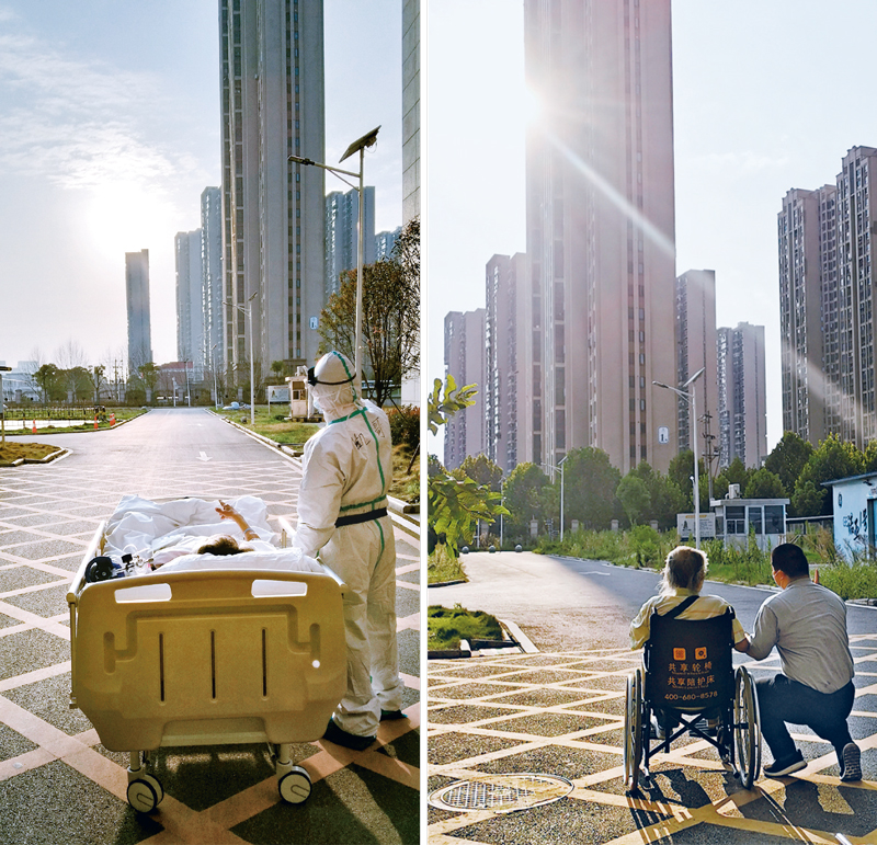 左图为2020年3月5日,在武汉大学人民医院东院,复旦大学附属中山医院援鄂医疗队队员、“90后”医生刘凯在护送已住院近一个月的87岁老人王欣做CT的途中停下来,一起欣赏了一次久违的日落(甘俊超/摄)。右图为时隔半年,9月4日,两个人在武汉大学人民医院东院重逢,重现携手看夕阳的温馨一刻(汪亭玉/摄)。武汉大学人民医院 杜巍巍供图