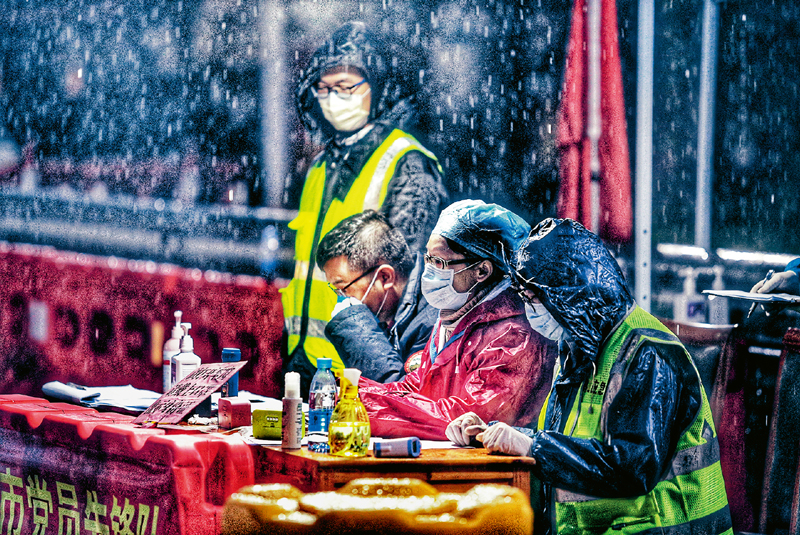 疫情发生后,广东省鹤山市广大党员、机关干部、民警,主动放弃休假,24小时轮值坚守岗位,全力打好疫情防控战,切实维护人民生命安全和身体健康。图为2月4日凌晨,鹤山市大雨倾盆,天气寒冷,党员干部、医务人员在公安民警、交通执法等单位人员配合下,对进入鹤山市的所有车辆人员进行体温检测、询问情况。人民图片 黄继明/摄