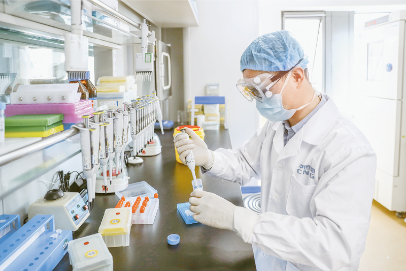 2020年4月11日,工作人员在国药集团中国生物新冠疫苗生产基地质量检定部门对新型冠状病毒灭活疫苗样品进行杂质检测。新华社记者 张玉薇/摄