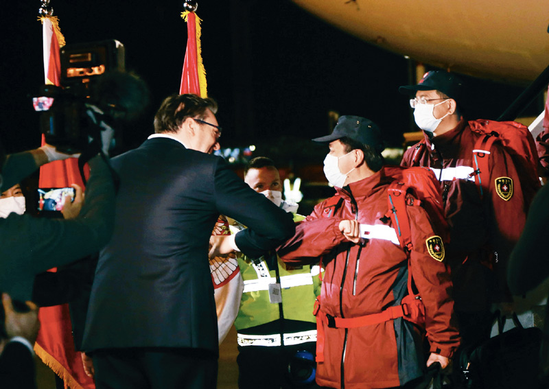 2020年3月21日,在塞尔维亚首都贝尔格莱德,前来迎接的塞尔维亚总统武契奇(左)与中国援助塞尔维亚抗疫医疗专家组成员“碰肘”致意。6名中国专家当天抵达贝尔格莱德,一批由中国政府捐赠的医疗物资也同机抵达。新华社记者 石中玉/摄