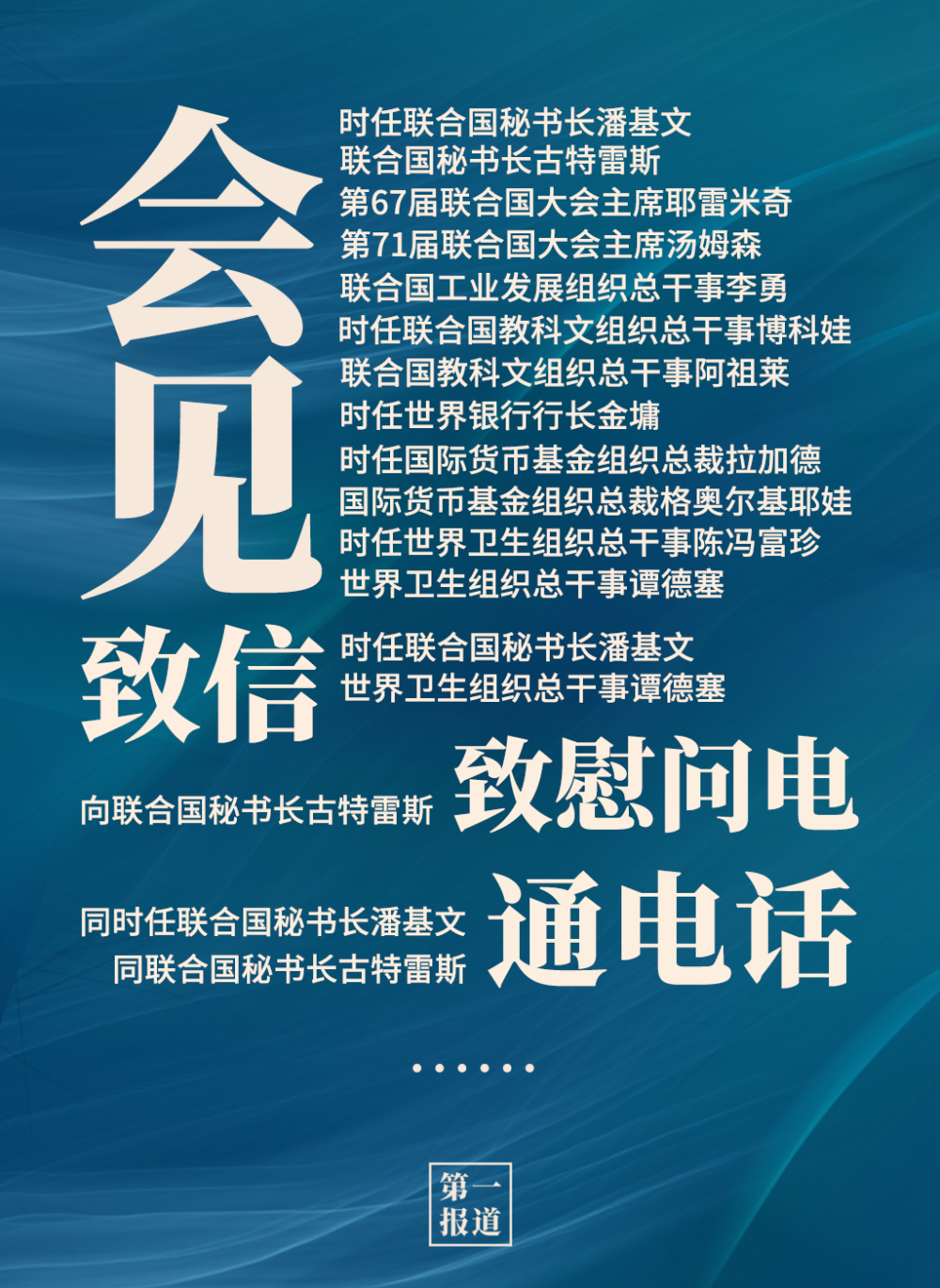 2013年以来,习主席通过会见、通话、致信函等多种方式同联合国主要官员保持密切沟通。互动对象包括联合国秘书长、联合国大会主席,还有联合国工业发展组织、联合国教科文组织、世界银行、国际货币基金组织、世界卫生组织等联合国专门机构主要负责人。